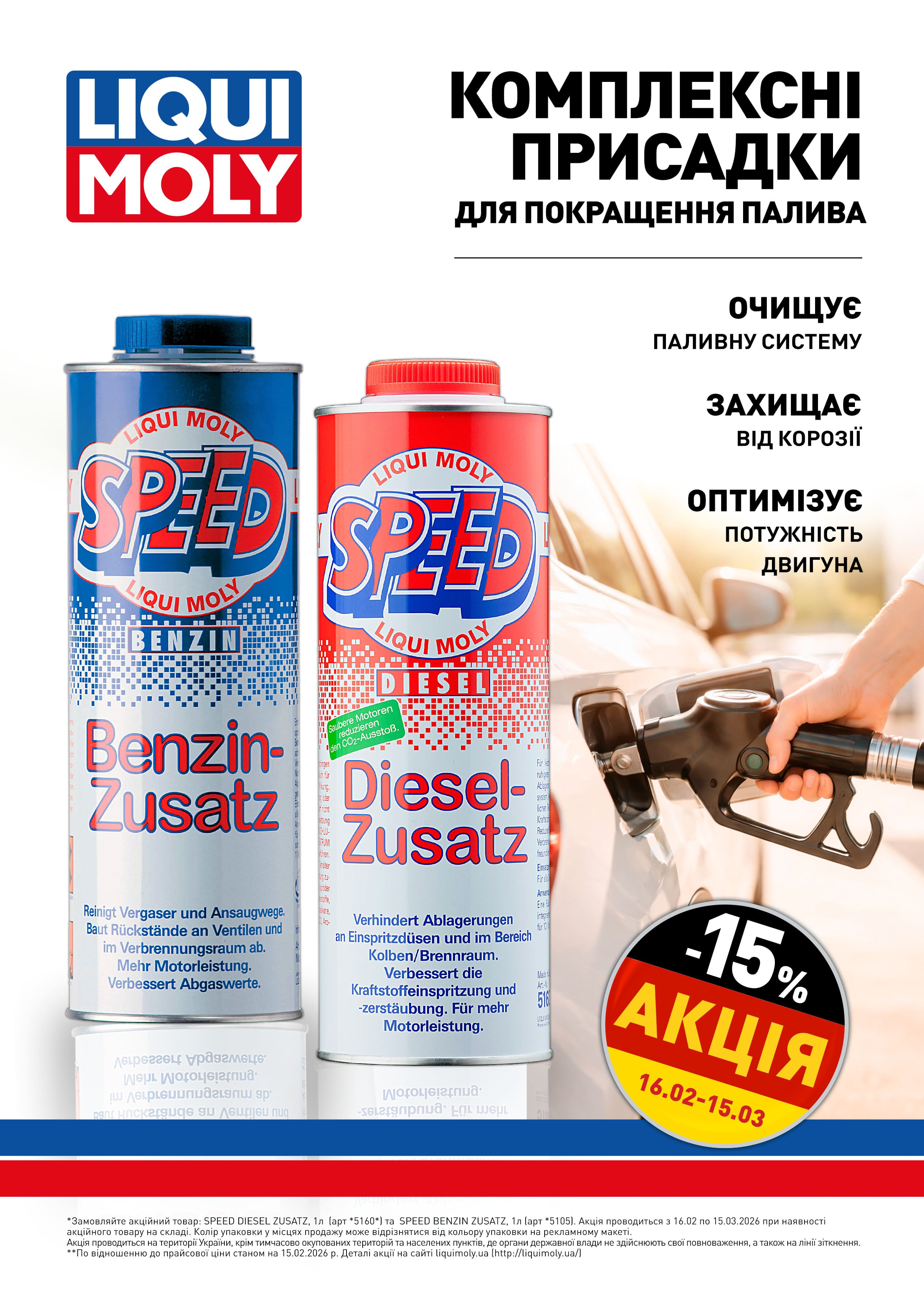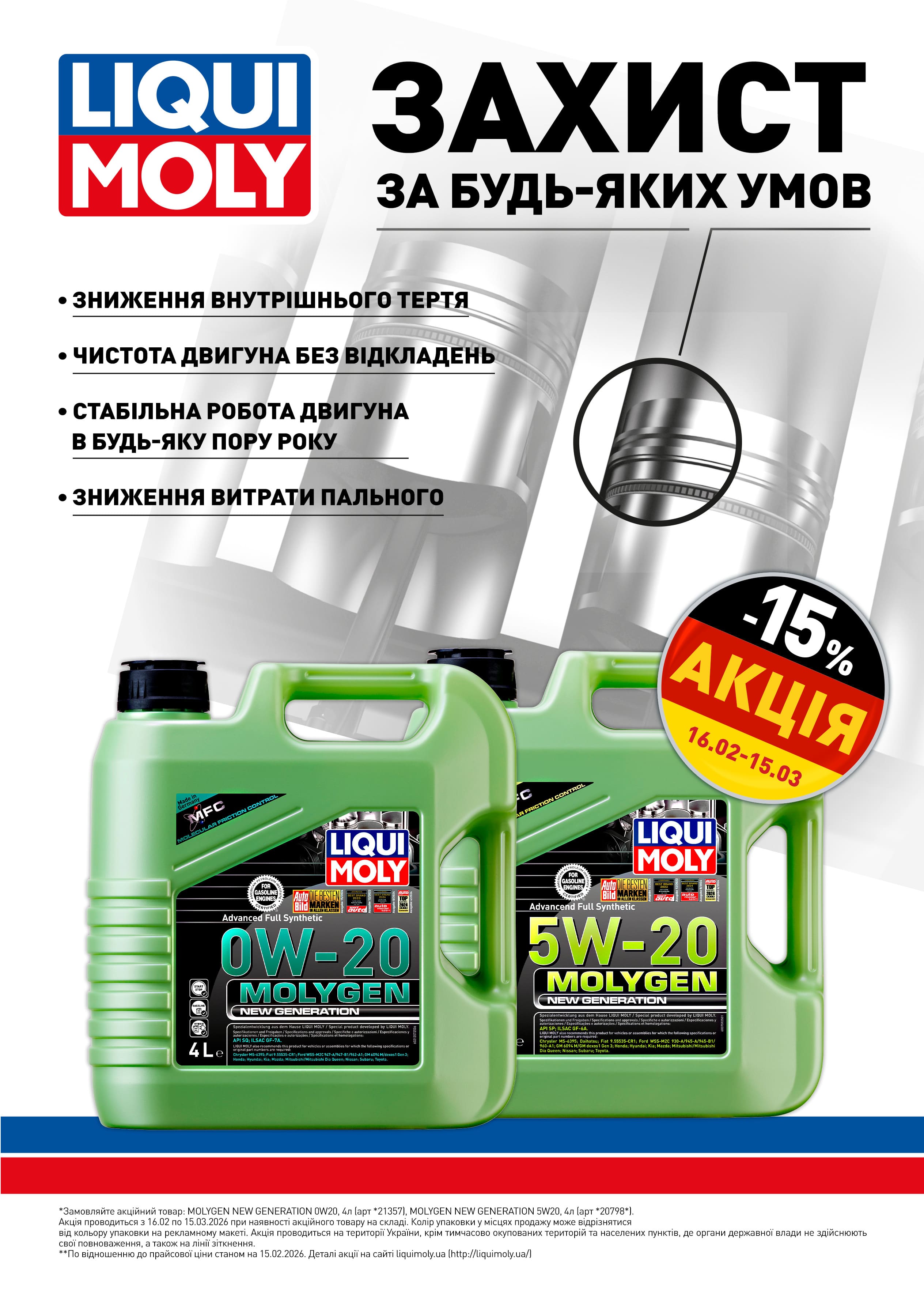 Скористайтесь вигідною пропозицією на популярні продукти Liqui Moly. Отримайте -15% на моторні оливи серії Molygen New Generation та комплексні паливні присадки Speed Zusatz – професійний догляд за двигуном за спеціальною ціною.