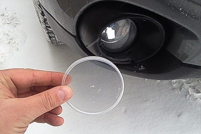 Є ще нестандартний варіант, який добре себе показав на практиці, проте підходить лише для деяких марок та моделей авто. У деяких машинах конструкція посадкового місця і бампера така, що фара втоплена вглиб і тому в поглибленні можна спокійно встановити пластикову кришку від коробки чіпсів «Прінглс». Такі кришки діаметром відмінно підходять під бампер і надійно фіксуються в поглибленні, захищаючи фару від перепадів температури.