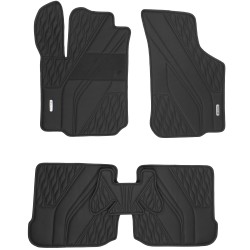 У набір килимків входить 4 аксесуари та захисна перемичка, що покриває центральний тунель заднього ряду. Кожен автокилимок має тришарову конструкцію. Для лицьової сторони використовується екошкіра, що по текстурі нагадує натуральну. Для зворотної – сучасний полімер з протиковзкими властивостями. А гумова підкладка виключає можливість найменшого протікання аксесуара. По периметру виробник доповнив килимки тасьмою, яка виконує не лише естетичну, а й практичну функцію. Для підвищення зносостійкості водійського килима виріб має посилений підп'ятник.